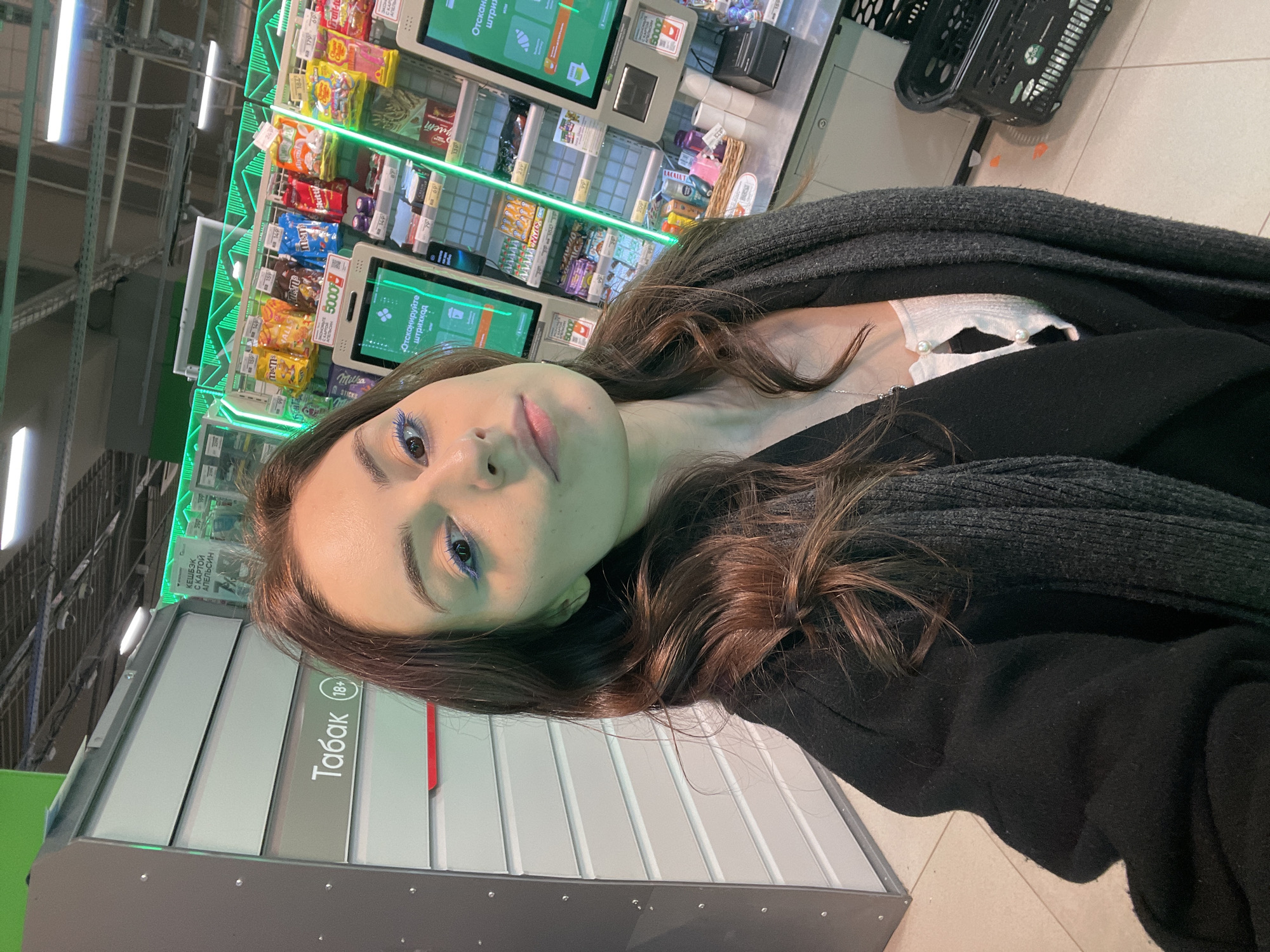 Here's a detailed description of the image: **Setting:** The image appears to be taken inside a supermarket. There are shelves stocked with various food items and self-checkout machines in the background. The self-checkout machines have illuminated displays with text in Russian. There is a "Tabak" (Tobacco) section to the lower left, also written in Russian, implying that the scene may be in Russia. **Person:** The main subject is a woman. She has brown hair and blue eyeshadow. She is wearing a black sweater over a white top. **Objects:** Various groceries are visible on the shelves. There is also a black shopping basket in the upper-right. The "Tabak" section is identified by its gray, horizontal, ridged surface with Russian writing. **Actions:** The woman is looking directly at the camera. The camera is close to her, suggesting a possible selfie perspective. **Interaction:** The woman is seemingly interacting with the camera, possibly taking a self-portrait in the supermarket. **Environment:** The overall impression is that of a modern supermarket setting, possibly within a large urban area. Based on the Russian text present in the image, it is plausible that the location is in Moscow, Russia.