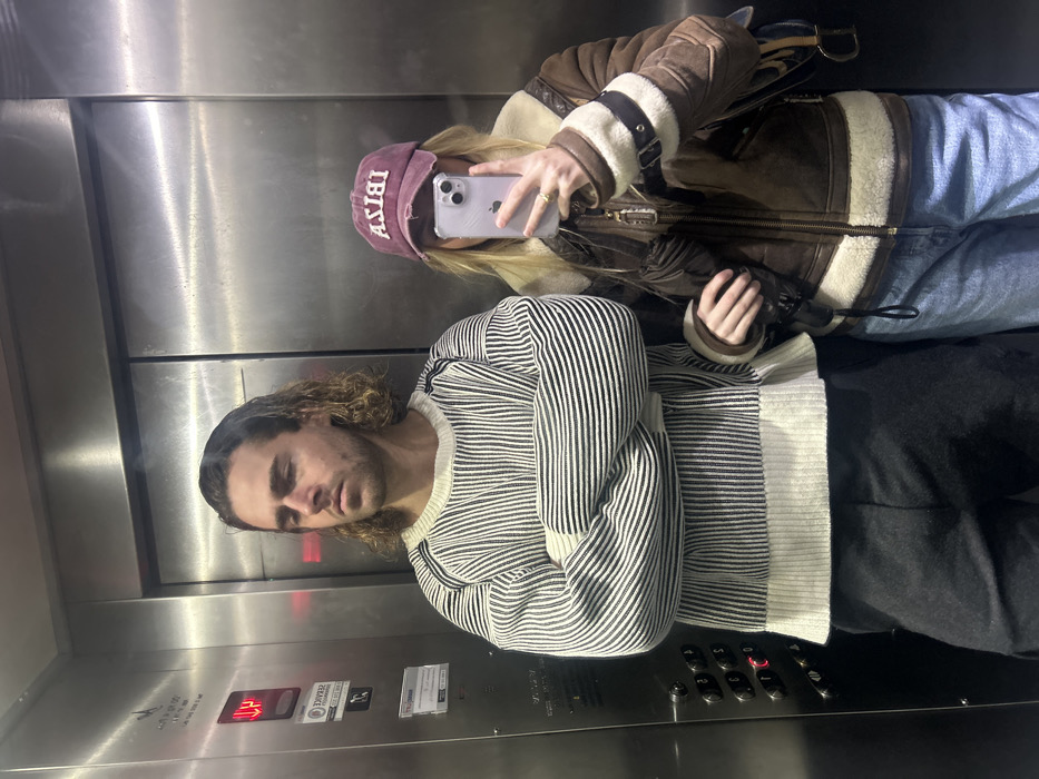 Inside a modern elevator with brushed stainless steel walls, two individuals are captured in a mirror selfie
