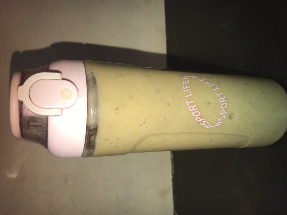 A clear plastic beverage bottle, approximately three-quarters full with an opaque, light yellow-green, textured liquid, stands upright on a dark, reflective surface