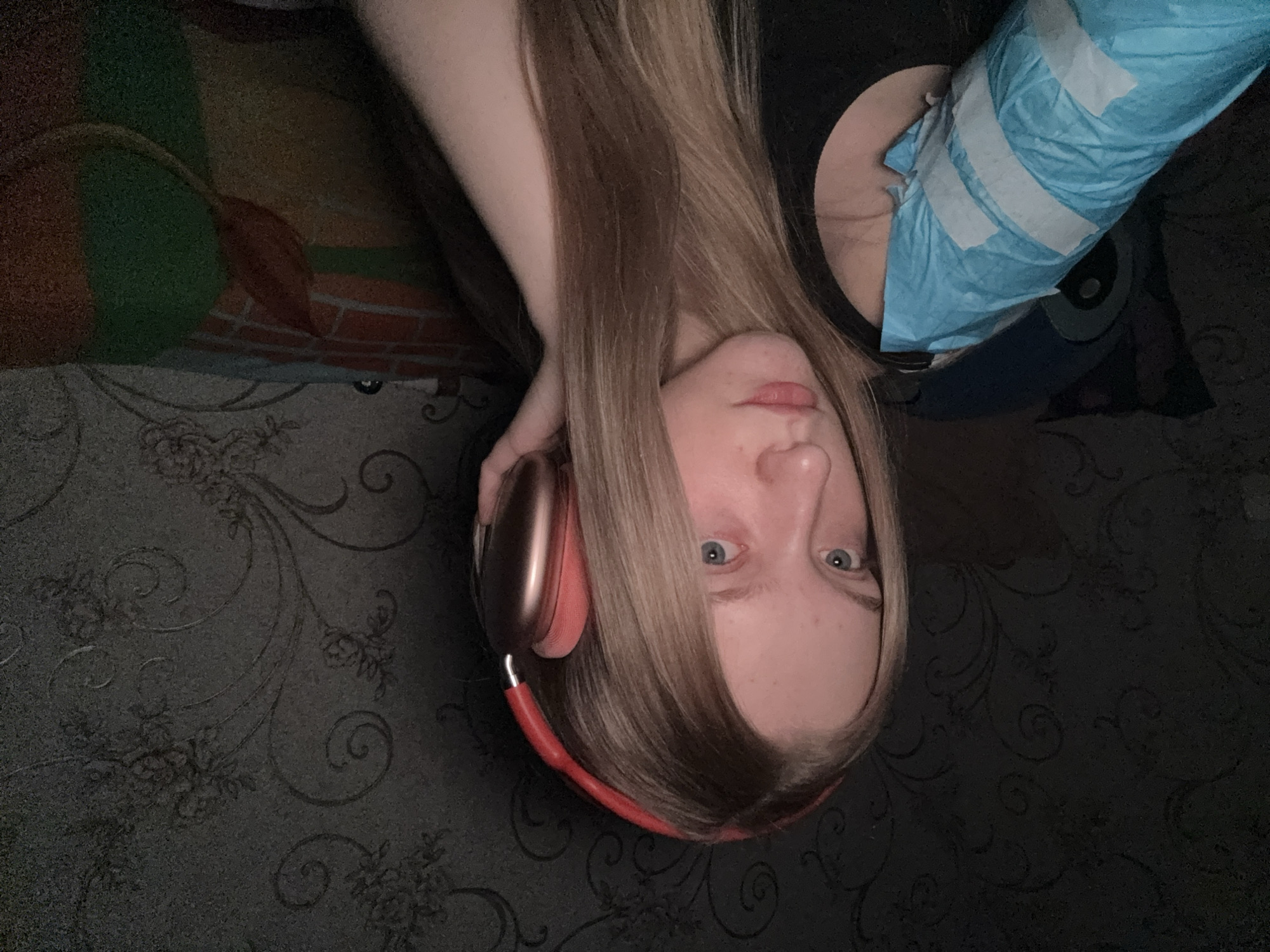 A pale-skinned person with long blonde hair and blue eyes is lying down wearing red headphones. They are wearing a black top. A blue and white object is in the background. The background is a dark floral pattern, possibly wallpaper or fabric. There is also a cartoon-style image in the background. There is no indication of the city of Saratov, Russia.