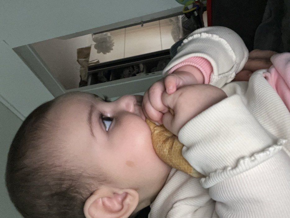 A baby is depicted in a close-up, profile view, consuming a food item in an indoor setting, presumably a residence in Strasbourg, France. The infant, possessing fair skin and brown hair, faces the right side of the frame, with dark eyes focused beyond the camera's view. A small, light-brown, circular mark is present on the baby's left cheek. The baby wears an off-white, long-sleeved, ribbed top with a visible pink lining on the sleeve cuff. Both hands firmly grip a golden-brown, folded, pastry-like object, which the baby is actively biting. The lower portion of an adult's hand or arm is visible supporting the baby. The background reveals an open doorway leading to another room, where a reflective surface, possibly a mirror on a wardrobe, reflects a white, fluffy decorative item. Obscured shelves with various items are also visible through the doorway. A multi-colored toy is partially visible on a surface in the far right background. The lighting is consistent with an interior environment.