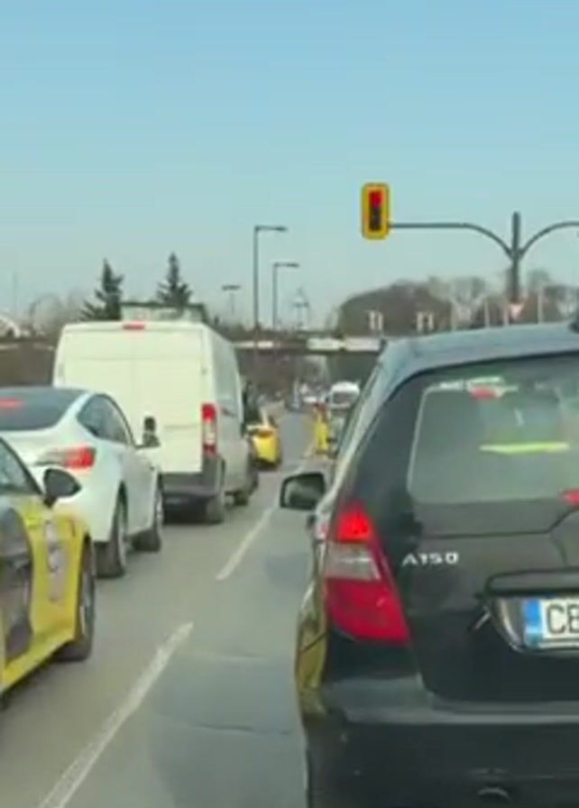 street in what appears to be an urban area. There is traffic, including cars, a van, and a taxi. The traffic is stopped at a traffic light which then turns green. A person dressed as a clown is standing in the crosswalk, juggling. The clown is wearing a yellow outfit with red accents. An overhead pedestrian bridge is visible, with signs indicating directions to "Centre" and "Orlov most". The weather appears to be clear and sunny. The video is shot from inside a car.