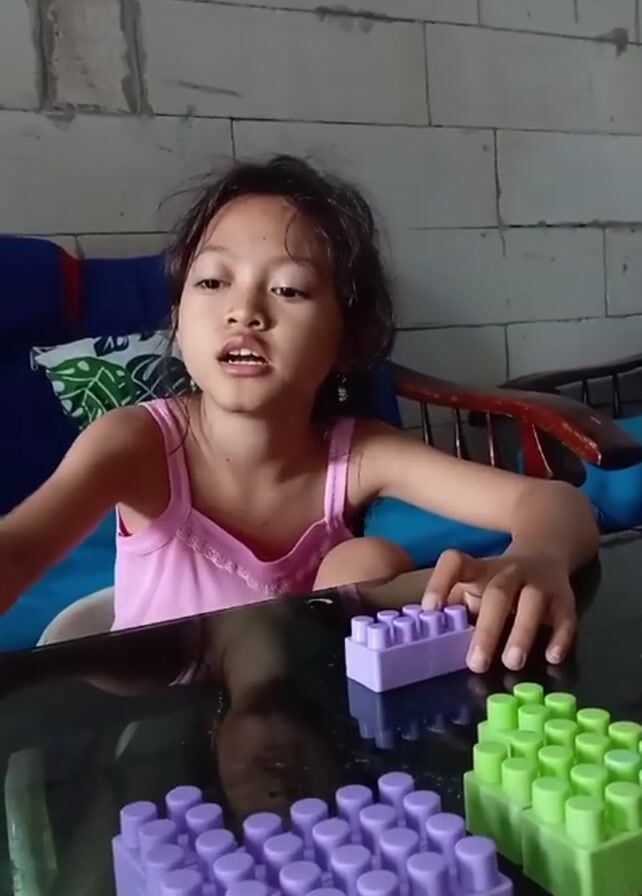 A young girl with dark hair is seated at a glass table in what appears to be a living room