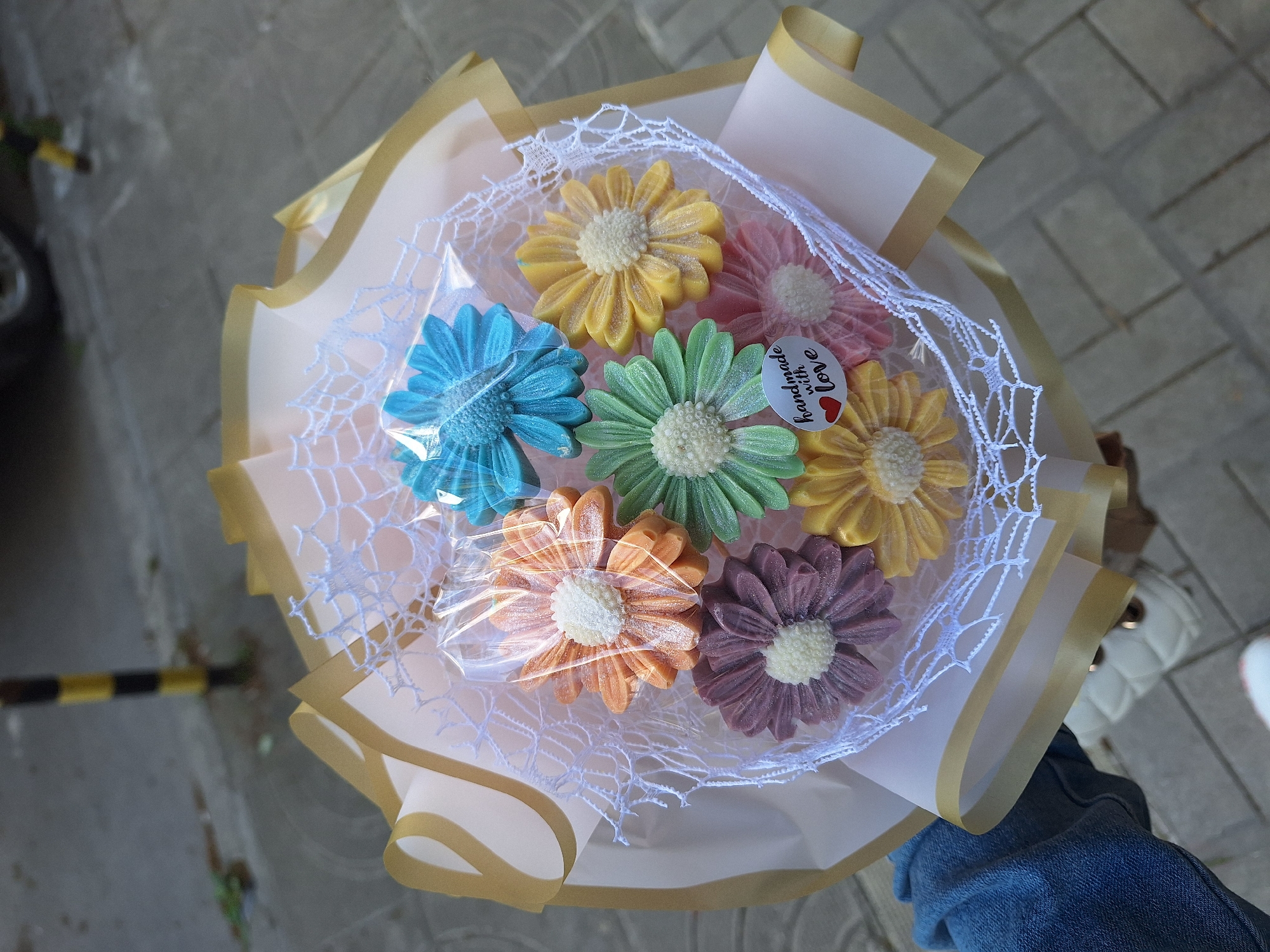 The image captures a bouquet of seven colorful, artificial flower-shaped sweets. The sweets are arranged in a white, net-like material, with a white and gold wrapper around the bouquet. The flower sweets are blue, yellow, pink, green, orange and purple. A small sticker with the words "Handmade with love" is attached to one of the sweets. The bouquet is held by a person wearing blue jeans. In the background, a section of a gray and white tiled sidewalk is visible, along with a yellow and black striped pole. Also visible are a white purse and a tire. Based on the evidence, the location is outdoors in an urban area, potentially within the city of Varna, Bulgaria.