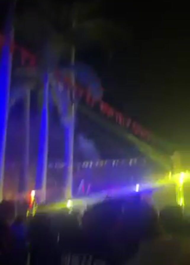 night-time scene at an outdoor event. Initially, the view is obscured by a crowd, lit with blue and yellow lights. People are visible, one wearing a jacket with the word "Justice" and a skull graphic. The camera then pans up to show palm trees against a dark sky. Fireworks explode above the trees, interspersed with bright spotlights. The moon is visible as a bright point in the sky. Festive banners are also seen hanging amidst the trees.