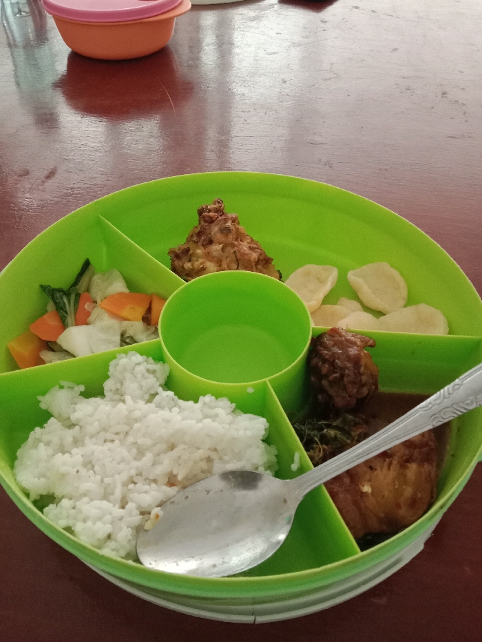 A green partitioned plate holds a variety of foods. In separate compartments are white rice, a mix of cooked vegetables, a fried item, and several white cracker-like chips. A second compartment contains what appears to be a cooked dish in gravy. A metal spoon rests on the plate, partially covering the rice and dish in gravy. A small, orange container with a pink lid is in the background. The entire plate is set on a brown surface.