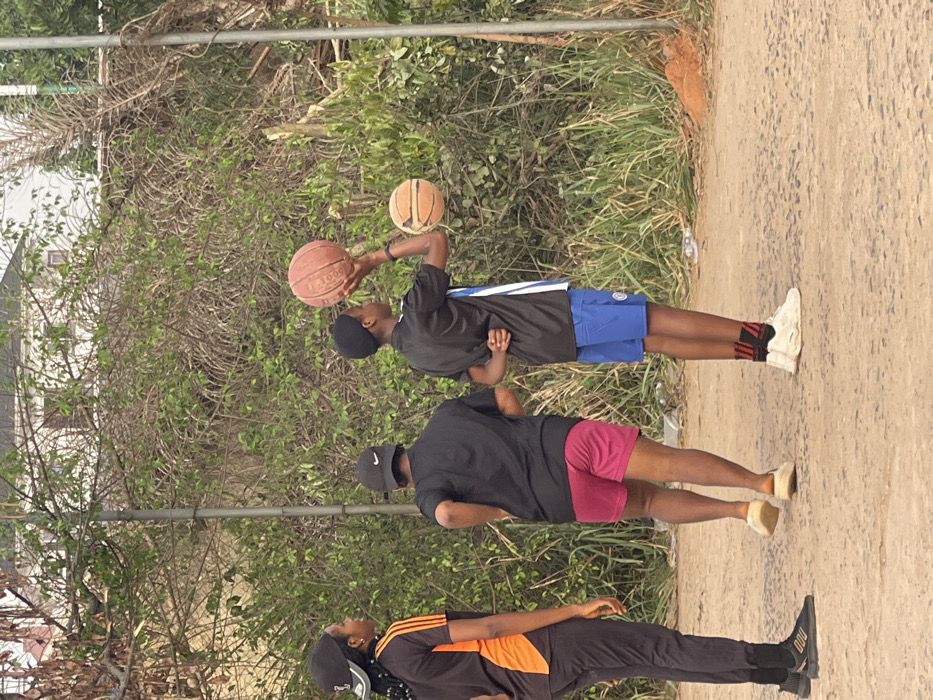 Three individuals wearing athletic attire stand on a paved surface next to a bushy area. The person at the top of the image holds two basketballs, wearing a black shirt with white stripes and blue shorts. The middle person has a black shirt with pink shorts and a black cap. The third person wears a black shirt with orange stripes, black pants, and a black cap. The background consists of overgrown shrubbery and hints of buildings.