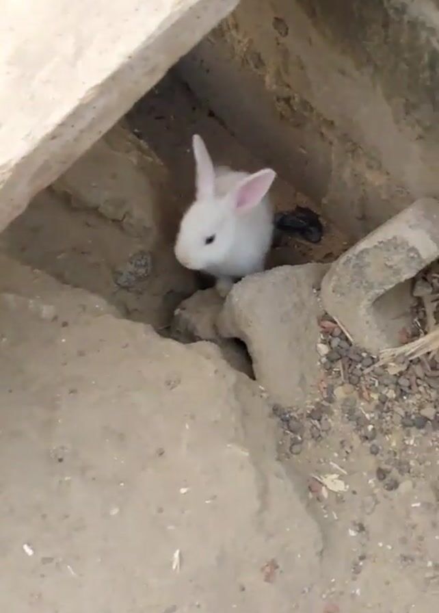 - "A small white rabbit is seen in a shaded area, nestled amongst rocks and dirt" by FM-ZTwSg2, licensed under CC BY 4.0