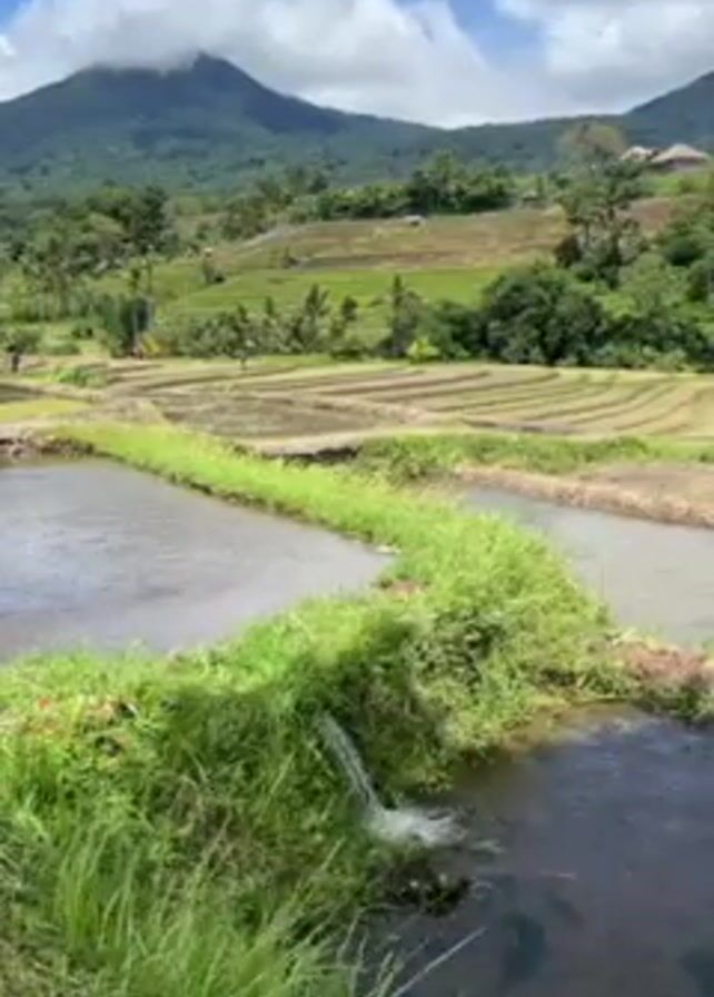lush, green rice paddy field in a mountainous region under a partly cloudy sky. The rice terraces are filled with water, and a small stream is flowing into one of the paddies. In the background, there are mountains covered in dense vegetation, with some cloud cover obscuring their peaks. The scene is serene and scenic, highlighting the natural beauty of the agricultural landscape.