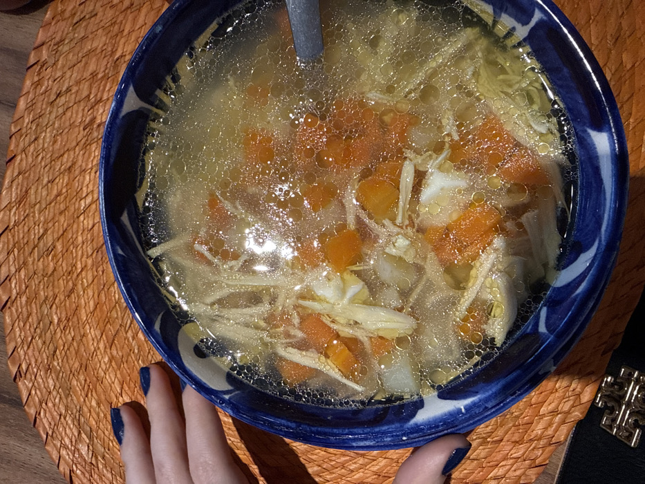 A blue patterned bowl holds chicken noodle soup with visible chunks of carrots and shredded chicken in a clear broth