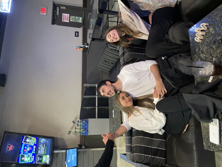 Three people are relaxing on a gray striped sofa. A smiling young woman is seated at the top, while a man in a white shirt and another woman in a white shirt are seated at the bottom, holding hands. A table beside the sofa holds a clear cup with a straw and a white phone. To the left, a television displays a golf game, and golf clubs are mounted on the wall.