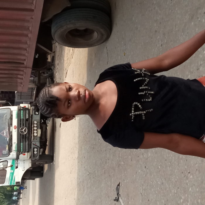 A young woman stands on an asphalt road, angled towards the viewer. She wears a black top with "PINK" spelled out in studs. Behind her, a large white and green Mercedes-Benz truck is partially visible, along with a truck bed above it. The road surface shows signs of wear. Several people are seen in the distance.