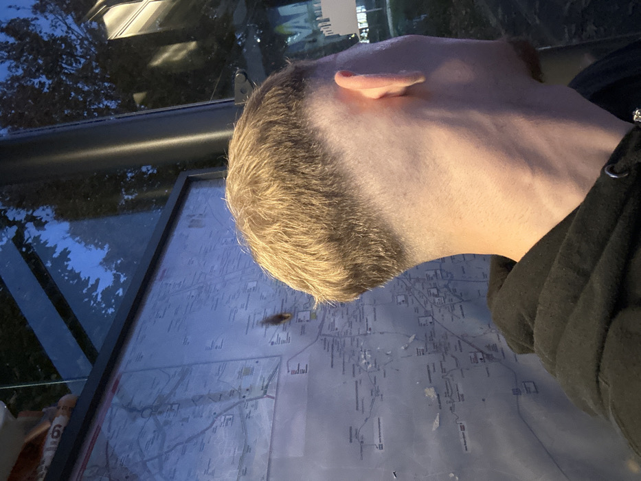 The image depicts the back and right profile of a male individual standing outdoors in Geispolsheim, France, during evening or night hours. The subject has short, light blonde hair styled with a high skin fade. He is wearing a dark hooded sweatshirt. Directly in front of the subject is a large, rectangular public information board or map, enclosed in glass, displaying a network of lines and text, likely public transport routes or a city plan. A small, dark insect or smudge is present on the glass surface of the map. To the right, a dark metallic structural pole, indicative of a bus stop shelter, is visible. Beyond the bus stop elements, dark tree foliage is silhouetted against a deep blue sky, and reflections of urban lighting, including a partial sign displaying "NAI" and a city skyline silhouette, are visible on the glass and in the distant background.