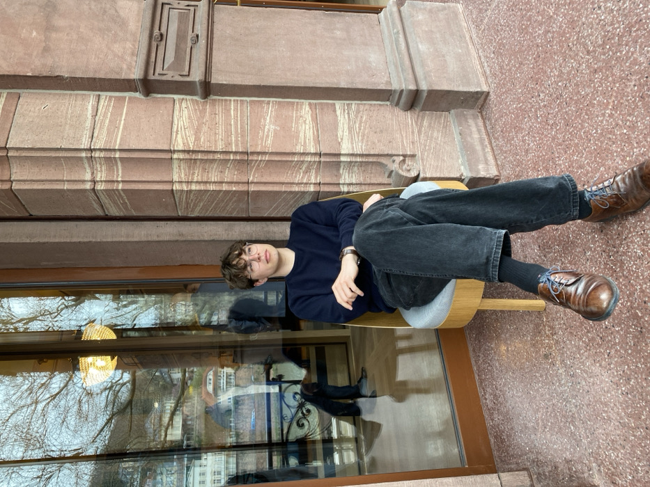 A young adult male, with light brown wavy hair and wearing light-rimmed glasses, is seated outdoors on a modern wooden chair with a light grey upholstered seat. He is dressed in a dark blue long-sleeved sweater, dark grey wide-leg jeans, black socks, and brown leather lace-up shoes with blue laces. A silver-colored watch is visible on his left wrist. His right arm is crossed over his left. He is looking slightly to his right with a neutral expression. The setting is on a reddish-brown terrazzo-style pavement, likely a veranda or sidewalk. To the left of the male subject is a large glass window or door, reflecting a cityscape characteristic of Heidelberg, Germany. The reflection shows bare trees, traditional multi-story buildings on a hillside, and a potential glimpse of the Neckar River. An ornate, possibly crystal, chandelier-like light fixture is also reflected high in the window. A partial reflection of another person, visible from the waist down, stands inside the building, facing the window. To the right of the subject is a reddish-brown sandstone building facade featuring carved pilasters with horizontal lighter striations and a decorative architectural recess resembling a historic mailbox on a wider column. The architecture suggests a historical European building.