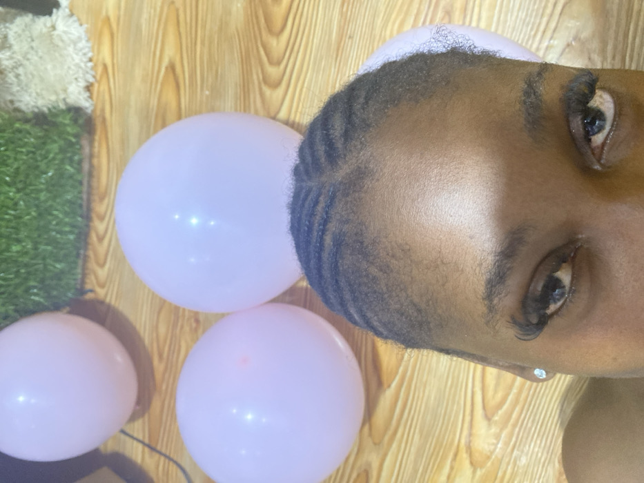 A close-up of a person with braided hair, light skin, and false eyelashes. The image is rotated to the side, focusing on their face and hair. Pink balloons are scattered around the person's head, adding a festive or celebratory element. The background consists of a light-colored wooden surface. Part of an artificial green surface is seen on the left, adding a touch of nature.