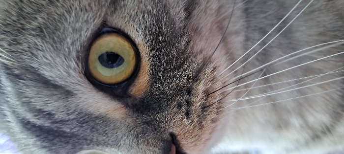 - "The image displays a detailed, vertical close-up of the right side of a domestic cat's face" by FM-FrnGi2, licensed under CC BY 4.0
