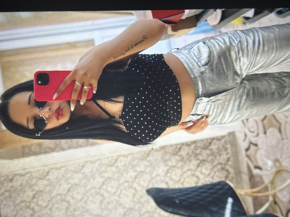 The image depicts a woman taking a mirror selfie indoors. The specific location in Dalgopol, Bulgaria, cannot be determined from the visual information provided. The subject is a young woman with long, straight dark hair, wearing dark, angular sunglasses and red lipstick. She is dressed in a black cropped halter top adorned with white polka dots and shiny silver metallic wide-leg pants. Her left hand, wearing multiple rings and sporting multicolored nail polish, holds a red smartphone with a ribbed case, positioned to capture her reflection in the mirror. A script tattoo is visible on her right forearm. The background shows a light-colored wall with a subtle patterned texture. To the left, a portion of a dark-colored, possibly quilted chair with metallic gold-toned legs is partially visible. On the right, blurred and indistinct shapes suggest other objects or furniture within the indoor setting.