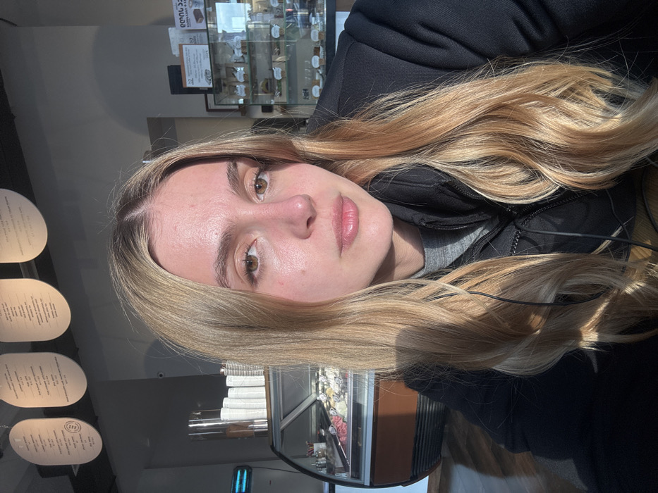 The image displays a female individual, appearing to be in her late teens or early twenties, inside a cafe located in Rustavi, Georgia. She is depicted in a close-up, chest-up perspective, looking directly at the camera. Her long, wavy blonde hair is parted centrally. She has brown eyes and light skin. Direct sunlight illuminates the right side of her face and hair, creating prominent highlights and shadows. She is dressed in a black zippered jacket worn over a grey long-sleeved garment; a black earphone cord is visible across her chest. The background shows the interior of the cafe. To the subject's left, a curved glass display case contains various colorful items, consistent with ice cream or desserts. A clear beverage dispenser and a stack of white disposable cups are positioned atop this case. To her right, a rectangular glass display cabinet holds packaged confections or pastries, with faint Georgian script visible on a sign above it. Multiple oval-shaped menu boards, listing items and prices with visible Georgian script, are suspended from the ceiling. A blue-glowing fixture is mounted on the wall to the far left. The floor is dark-toned, resembling wood. No other individuals or interactions are visible.