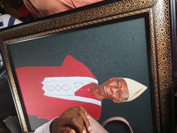 framed portrait of a man wearing a red shirt, a white robe, and a yellow cap. The portrait is being held up by a person whose hand is visible in the lower right corner of the image. The portrait is framed in a black frame with a gold pattern. The frame is made of wood and has a textured surface. The man in the portrait has dark skin, and his face is visible. The man is looking at the viewer with a serious expression. The background of the portrait is a dark gray color. The coordinates provided are for Ohunene, Nigeria. However, there is no way to determine the location of the picture based on the image alone.