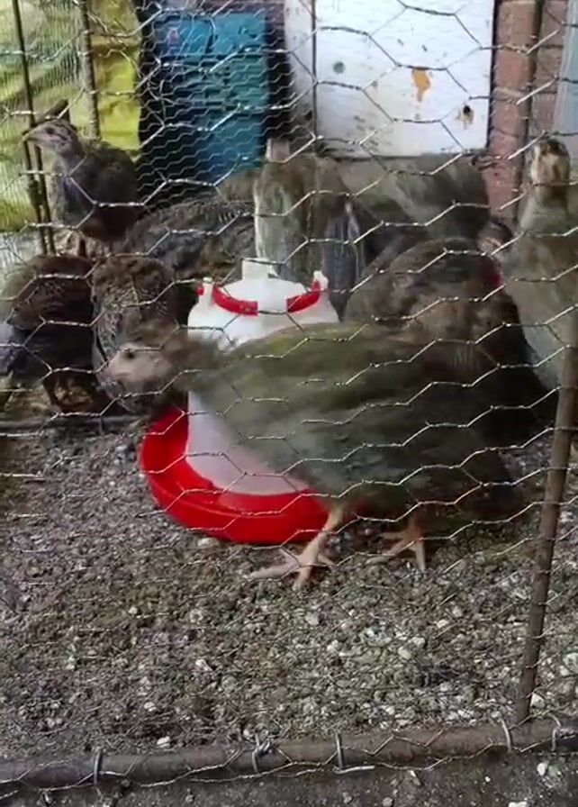 group of guinea fowl keets inside a wire cage. A white and red water dispenser is in the center of the cage. The ground is covered with dark material. The birds are mostly gray and brown with speckled feathers. Some of the birds are drinking from the dispenser, while others are walking around. Behind the cage are some indistinguishable objects and a brick wall.