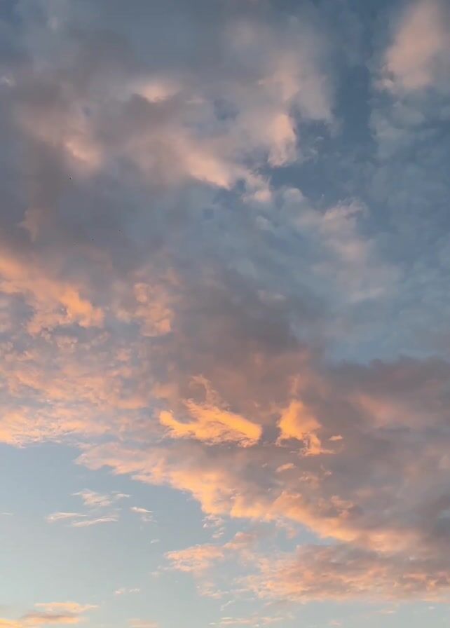 vertical view of a sunset sky. The sky is a blend of pale blue and gray, dotted with numerous small, puffy clouds. These clouds are tinted with orange and pink hues, particularly around their edges, due to the setting sun. The lower portion of the sky transitions into a lighter blue near the horizon. In the very bottom right corner, a small, dark silhouette of a building or structure is visible against the sky.