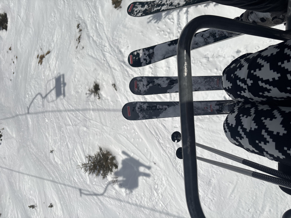 The scene depicts a view from a ski lift above a snow-covered mountain slope in Sankt Anton am Arlberg, Austria. In the immediate foreground, a dark, curved metal safety bar of the ski lift is visible. Below the bar, the lower torso and legs of at least two individuals are suspended. One individual wears black and white patterned ski pants. Four skis, dark grey with white and red markings, hang vertically from ski boots, two belonging to the individual in patterned pants and two to an adjacent person. Two ski poles are secured within the lift structure. The ground below is a bright, white ski slope covered in numerous parallel ski tracks, indicative of recent activity. Several small evergreen trees are sparsely scattered across the slope. Strong sunlight casts distinct shadows on the snow, including the shadow of the current ski lift chair carrying two occupants and the shadow of an empty lift chair further along the cable.
