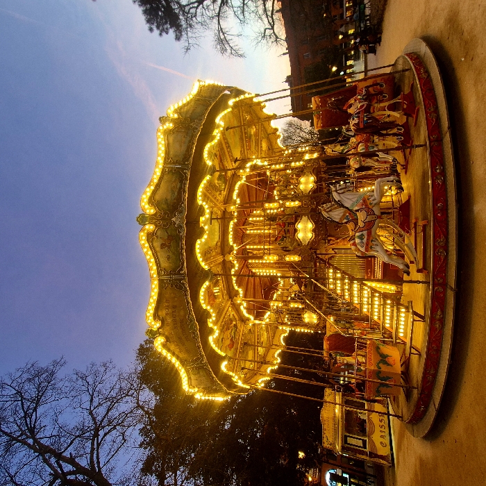- "An ornate, two-tiered carousel, brightly illuminated with warm yellow lights, occupies the central foreground of a park scene at dusk or early night" by FM-DaNa73, licensed under CC BY 4.0