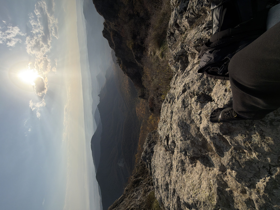 The image displays a ground-level perspective from a high, rocky vantage point within a mountainous area near Tbilisi, Georgia. In the immediate foreground, a person's legs, clad in dark pants and black minimalist-style shoes with yellow details, are extended over a sun-drenched, grey-brown rock surface. A black backpack or bag is positioned to the right of the legs on the same rock. The scene looks out over a vast valley and successive layers of mountains, characterized by steep, dark slopes and patches of trees exhibiting autumn colors. The distant mountain ranges appear progressively lighter due to atmospheric haze, extending to a horizon line. The upper sky is bright, with a prominent sun in the upper right, partially obscured by scattered white clouds, casting distinct rays of light across the scene.