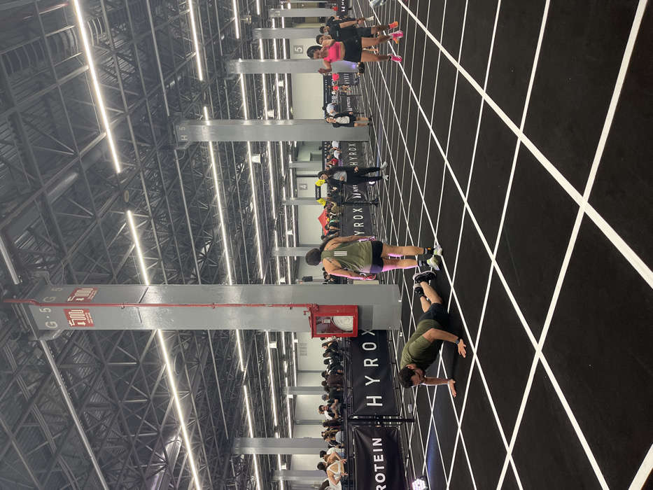 A large indoor event space shows participants in athletic wear on a black floor with white grid lines. Overhead, an industrial ceiling with numerous lights and structural supports is visible. People are arranged along marked lanes with "HYROX" branding. A gray column with red accents supports signage marking distances, adding to the event atmosphere. Some individuals appear to be stretching or warming up before their competition.