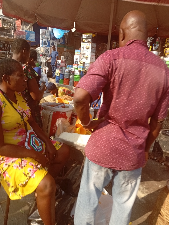An outdoor market scene shows a woman in a bright yellow floral dress sitting at a stall. She has a colorful purse on her lap. A man in a red, dotted shirt and jeans stands near the stall, partially obscuring the view. Behind them, other people mill about amidst goods for sale, including food items in bags and various household appliances stacked on shelves under an awning. The scene is brightly lit, suggesting a sunny day.