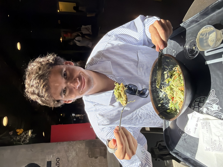 A person in a striped shirt holds a spoonful of salad next to a bowl of salad