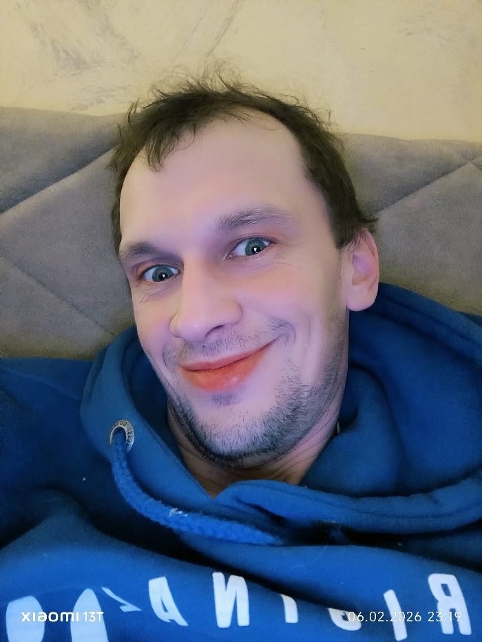A selfie features a smiling man with blue eyes, wearing a blue hooded sweatshirt. He has short, dark hair and light stubble. The background shows a gray quilted headboard. "XIAOMI 13T" and a date "06.02.2026 23:19" are visible in the lower corners of the image, likely watermarks from the camera. The lighting is somewhat artificial, casting a slightly blueish hue on the scene.