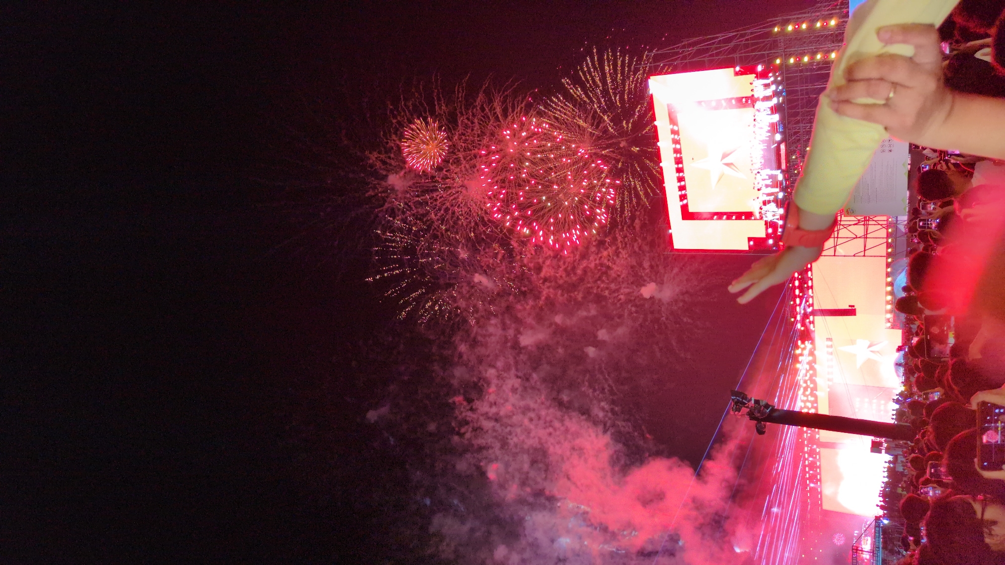 The image captures an outdoor night event occurring in Quy Nhon Ward, Vietnam. The upper portion displays multiple fireworks bursts in red, yellow, and gold against a dark sky, accompanied by significant plumes of red-illuminated smoke. Below the fireworks, a large stage structure is visible, featuring several brightly lit LED screens. These screens prominently display a white five-pointed star on a red background, with figures of individuals visible on one screen. Red and blue laser lights project horizontally and diagonally across the scene, cutting through the smoke. The lower half of the frame is occupied by a dense crowd of people, many of whom are holding up smartphones, indicating recording or photography. In the immediate foreground on the right, a person's left arm, clad in a light yellow long-sleeved garment, is raised with an open hand; a ring is visible on the fourth finger. A tall, dark pole with attached equipment extends upwards from the crowd in the mid-ground, and metal scaffolding supports the stage and screens.