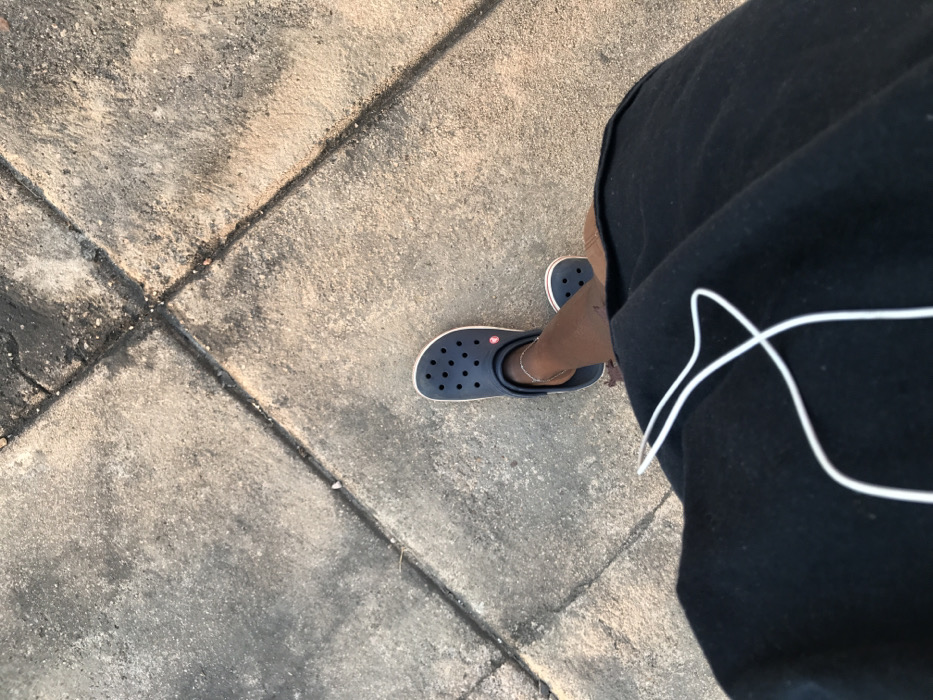 A person stands on a concrete sidewalk divided into rectangular sections. They wear black shorts with a white stripe pattern and navy Crocs, with an ankle bracelet visible. The sidewalk appears worn, showing varying shades of gray and some dark patches. The image is taken from a high angle, focusing on the individual's feet and a portion of their clothing.