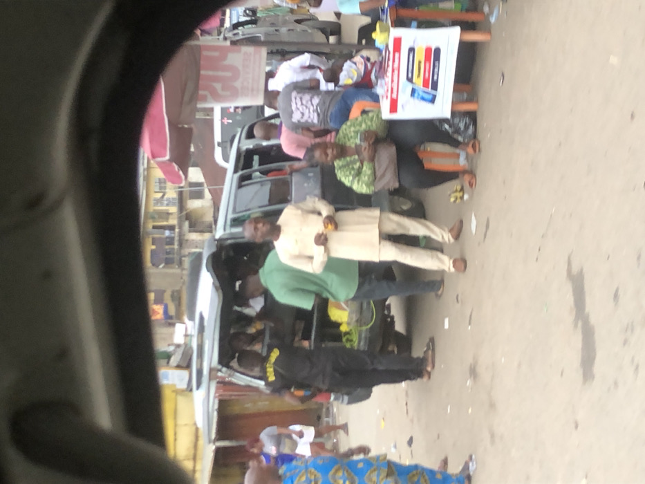 A roadside scene shows a van filled with passengers. A man in a tan suit and another in a green shirt stand outside the van. Another man in a black uniform stands behind them. A table with advertisements is nearby. Pedestrians are scattered on the sidewalk. The image appears to be taken from inside a vehicle.