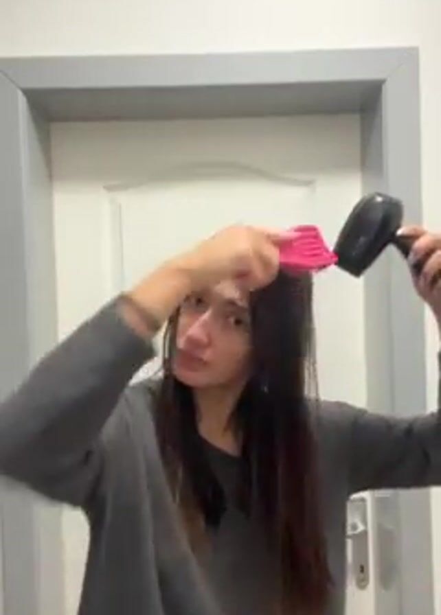 A young woman with long, dark, damp hair stands in front of a white door with a gray frame. She is wearing a gray long-sleeved shirt. She holds a black hairdryer in her right hand and a pink brush in her left. She is brushing and blow-drying her hair. The background is a plain white wall.