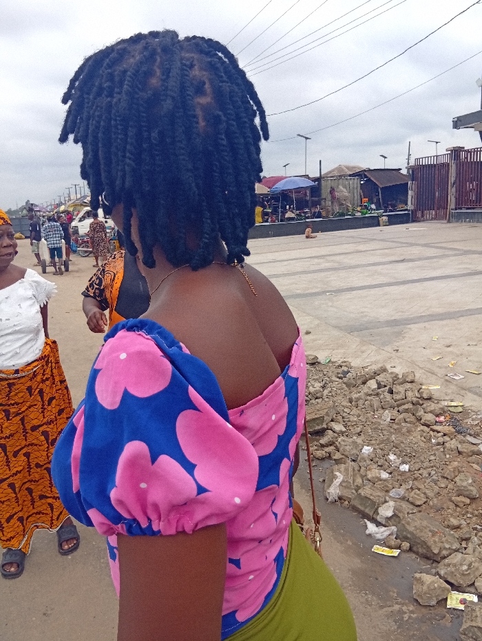 The scene depicts an outdoor urban environment identified as Ura Nta Umuarandu, Nigeria, under an overcast sky. In the foreground, a person with dark skin is viewed from behind, facing away from the camera. This individual wears dark, twisted dreadlocks or braids extending to the upper back. They are dressed in an off-shoulder top with a blue base patterned with large pink floral motifs and puffed sleeves, revealing the upper back. A thin gold-colored necklace is visible on the upper spine, and a brown shoulder bag strap is draped over the right shoulder. The lower garment is olive green. To the immediate left, a second person with dark skin is partially visible, facing left. This individual wears a yellow headwrap, a white textured top, an orange and brown patterned wrapper or skirt, and dark sandals. The background presents an open-air market or street scene. Numerous individuals are distributed across the area, walking and standing. A small child is seated directly on a paved section of the ground. Market stalls, characterized by corrugated metal construction and a blue umbrella, are visible. A brown metal gate structure stands on the far right. The ground in the mid-distance is paved concrete with faint markings. The right side of the foreground and midground consists of an unpaved area strewn with various rocks, dirt, and litter, including papers and plastic. Two light-colored chickens are observed foraging within this debris. Overhead, utility poles with wires and streetlights, some equipped with solar panels, are visible against the grey, overcast sky.