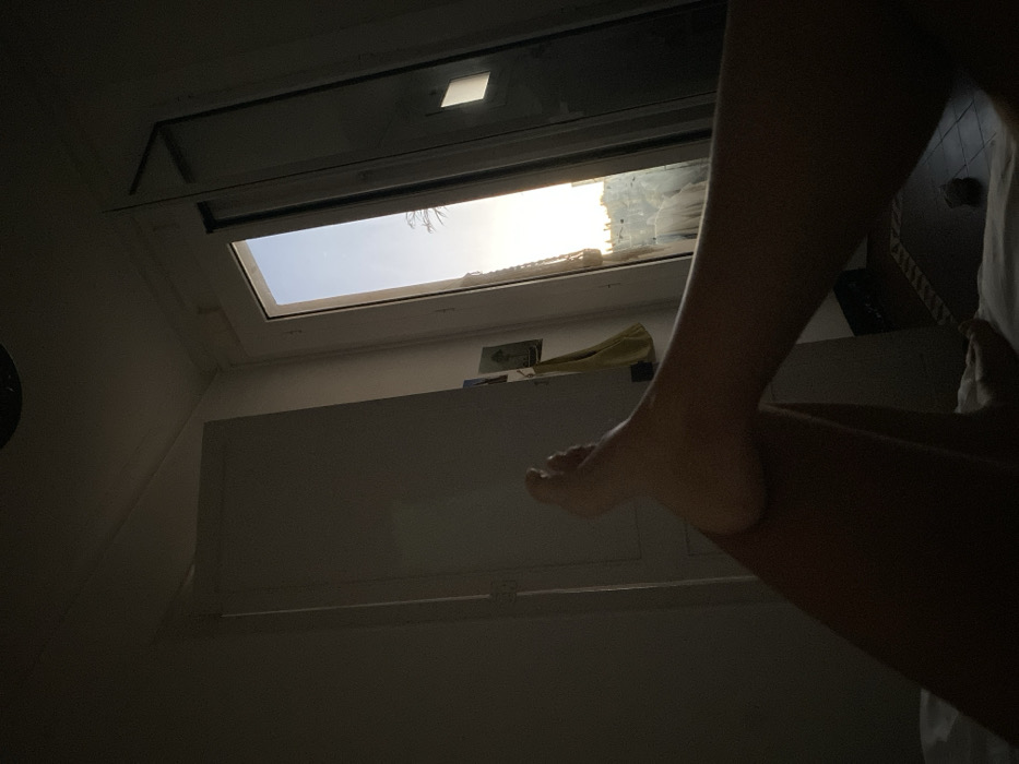 The image depicts an indoor scene from a low perspective, focusing on the bare, tanned legs and feet of an individual, positioned as if resting