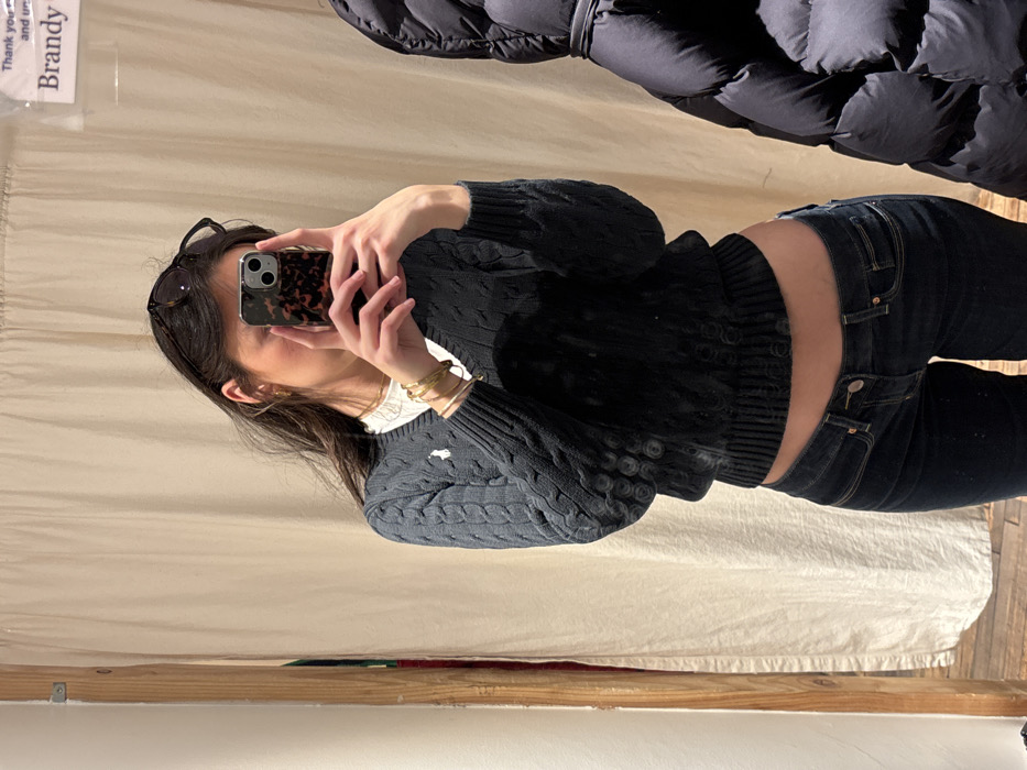 A person stands in front of a mirror, taking a selfie with their phone. They wear a navy blue cable-knit sweater, dark jeans, and a white collared shirt peeking out from under the sweater. Sunglasses rest on their head. A black puffy jacket hangs partially visible above them. A tag or sign with the word "Brandy" is visible in the upper left corner of the frame. The background is a plain, light-colored curtain.