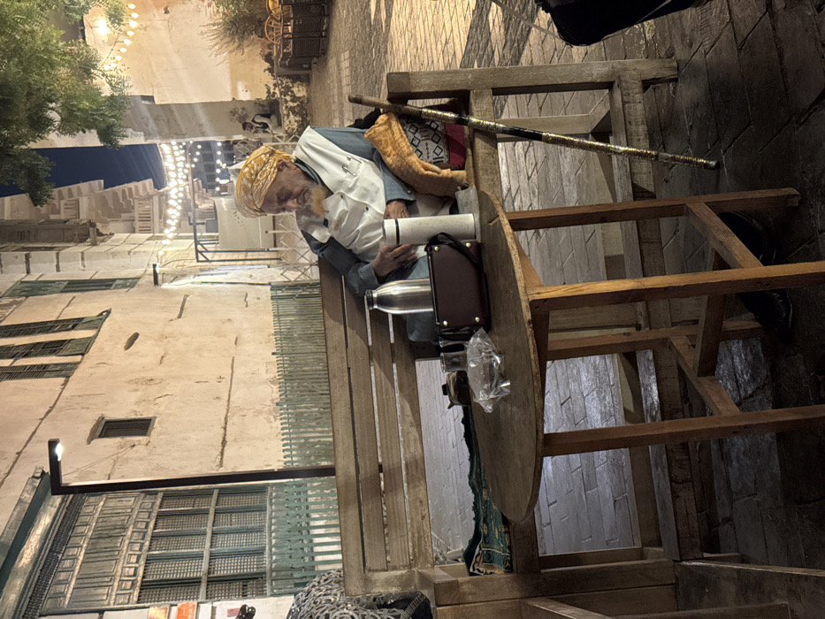 This image depicts an outdoor night scene in the historic district of Al Balad, Jeddah, Saudi Arabia. An elderly man, distinguished by a yellow turban and a prominent white beard with reddish-orange tint, is seated on a light-colored wooden bench. He wears a light blue long-sleeved garment topped with a white sleeveless vest, and his eyes appear closed. To his left on the bench, a silver metallic thermos stands upright. To his right, a white travel mug rests near a folded, patterned fabric, beside which a gold-embellished walking stick leans against the bench. A round, light-colored wooden high-top table is positioned directly in front of the man. On the table, a dark brown leather handbag, a clear plastic bag containing an indistinct item, and two small clear glasses are visible. A small dark teapot-like object is also present on the table. A green and white patterned mat is placed on the stone-paved ground beneath the bench. The background features traditional multi-story buildings characteristic of Al Balad, with light-colored facades, intricate wooden window screens, and closed wooden shutters. A modern street lamp is visible on the left. The narrow street is illuminated by overhead string lights adorned with numerous small bulbs, extending into the background where additional individuals occupy outdoor seating areas under similar lighting conditions. Dark foliage from a large tree is visible on the far right.