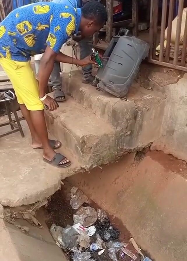 Two men are working on the electronics of a black speaker. The speaker is propped up on some concrete steps next to a trash-filled ditch. The man in the yellow shorts is holding the electronic components and appears to be focused on his work. The second man is standing behind him, also looking at the components. The scene takes place outside, with a building visible in the background.