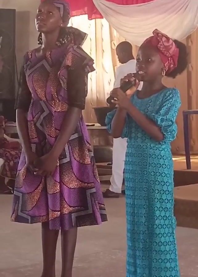 Two young African girls stand indoors on a low platform, against a backdrop of white drapes and a red curtain displaying the word "HAPPY". The girl to the right holds a microphone and speaks into it. She is wearing a teal-colored, long-sleeved dress with an intricate, patterned design, and a red headscarf tied atop her head. The girl to the left is wearing a short-sleeved, purple dress with a multi-colored pattern and a matching headscarf. Her hands are clasped in front of her, and she is holding a microphone. Both girls are dark-skinned. A man in a white robe stands in the background behind them. The location appears to be a church or event space. There is a wooden structure beneath the platform and a chair to the right side of the frame. The logo of “Infinix NOTE 30 Pro” is visible in the lower left corner of the frame.