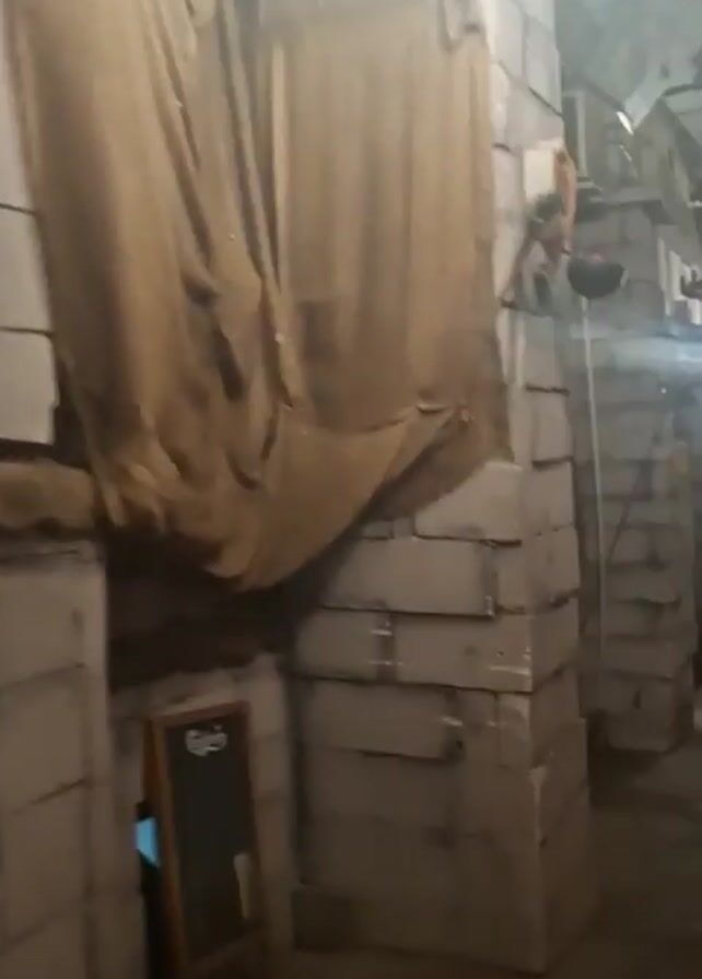 man walking down a hallway. The hallway is decorated to look like a dungeon, with faux stone walls. There are also decorations like stained glass windows, banners, and string lights. There are AC units on the wall. The man is wearing a black jacket.