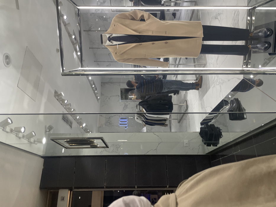 A store display features a tan overcoat with a navy suit and gray shoes. A man in a blue striped shirt, jeans, and brown boots is seen near other apparel, including a black jacket and white and navy shirts. The store has marble walls, a black cabinet, and ceiling lights. The image is taken from a low angle, showing a reflection of the scene in a glass surface.