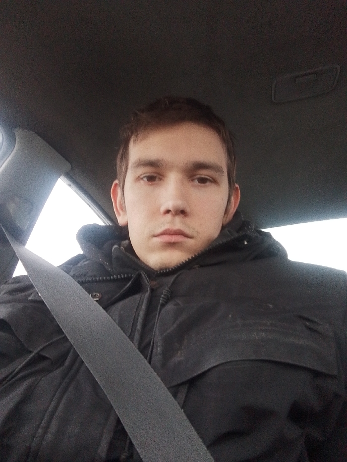 An individual, male, with short brown hair and a neutral expression, is depicted from the chest up, looking directly into the camera. He is seated inside a vehicle, indicated by the dark headliner, a visible grab handle on the ceiling, and a grey seatbelt crossing his torso diagonally from his left shoulder to his right hip. The individual is wearing a dark-colored (likely black) winter jacket with visible zippers and pockets. A window to the left side of the frame reveals a bright, undifferentiated light source, suggesting an overcast sky or bright outdoor conditions during daytime. The specific location in the city of Zanevka, Russia, cannot be determined from the visual information present in the image.