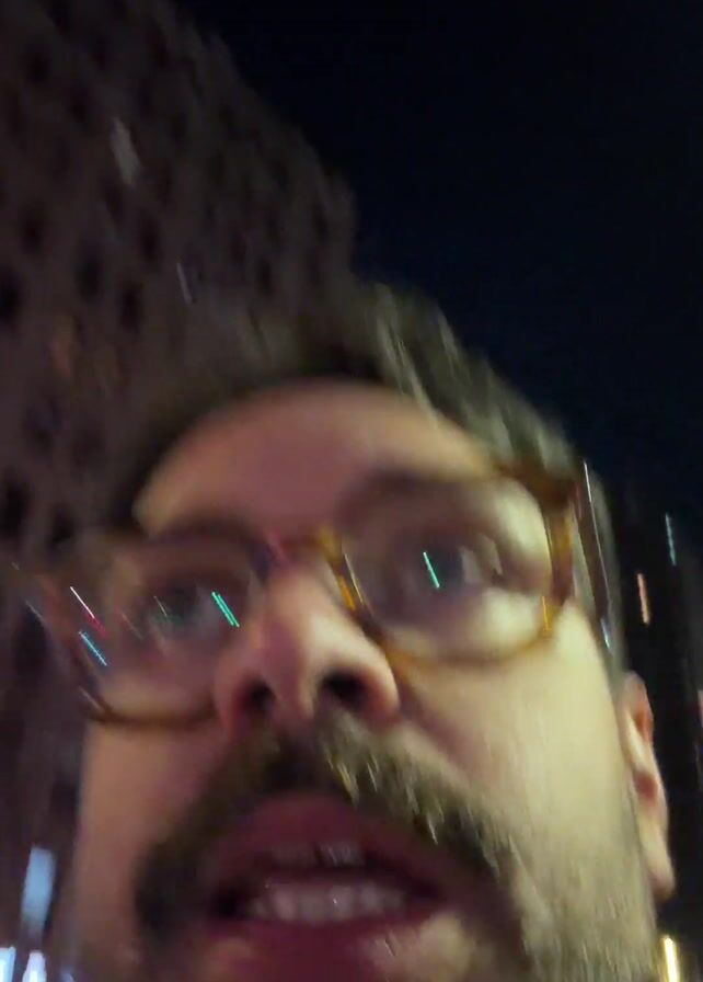 A close-up, blurred video shows a person with glasses and a mustache. They are looking directly at the camera, with city lights visible in the background. The person is moving, and their expression is animated, with their mouth open. The lighting suggests it's nighttime.