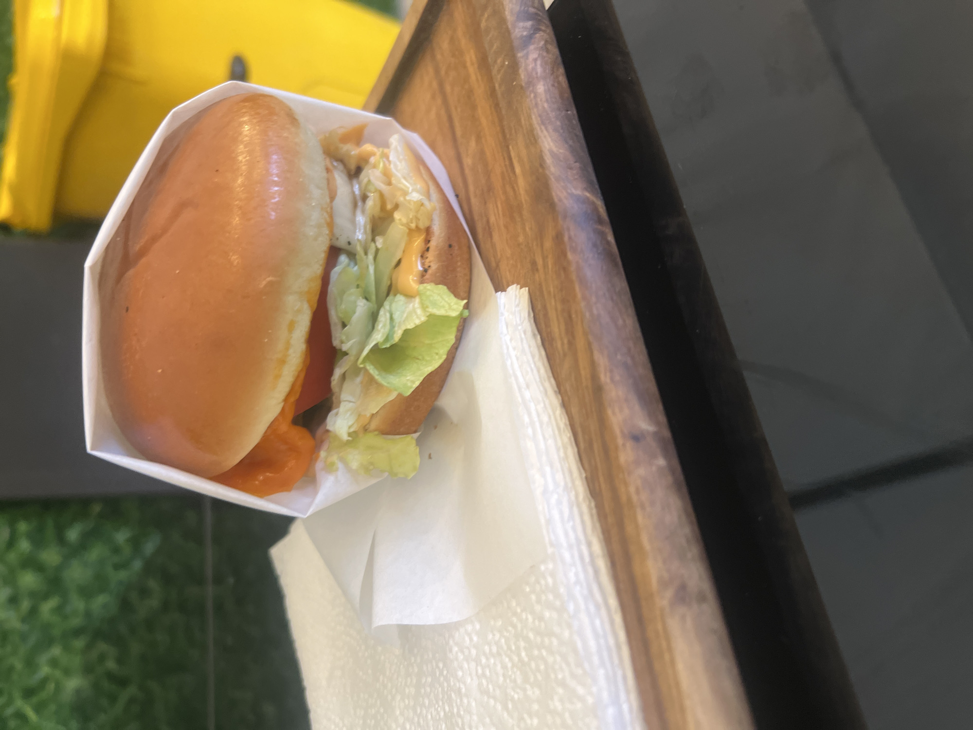 burger in a white paper container, placed on a wooden tray with a white napkin. The burger appears to have a glazed bun, lettuce, tomato, and some sort of sauce. The background includes a glimpse of a yellow object and some artificial grass. The photo was taken in Sofia, Bulgaria.