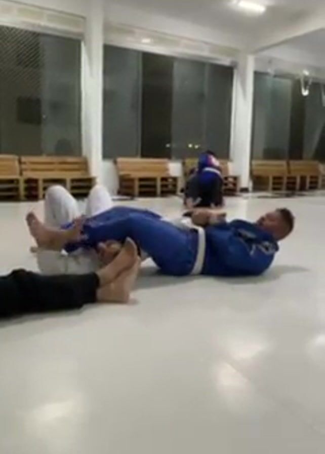 three people practicing jiu-jitsu in a gym. Two of them are on the ground, one wearing a white gi and the other a blue gi. The person in the blue gi has their legs up, and the person in the white gi is positioned between their legs. The third person is standing in the background, also wearing a blue gi, and appears to be adjusting their belt. The gym has white floors and walls with large windows along one side. Some wooden pallets are stacked against the wall beneath the windows. Overhead lights illuminate the room. The camera angle is at floor level, providing a wide view of the scene.