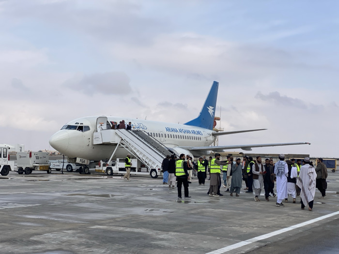 An aerial view of an airport tarmac in Unknown, Afghanistan, depicts a white Ariana Afghan Airlines Boeing 737 aircraft, with a blue tail section featuring a stylized bird logo