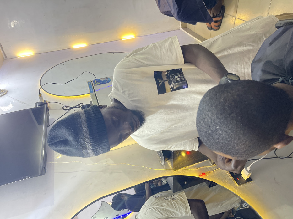 A tilted overhead shot captures a man wearing a white t-shirt with a graphic design, a black and gray beanie, and a watch. He appears to be sitting at a table. Beside him, another man's dark hair is visible. The environment includes a TV screen on the wall, round wall decorations with integrated lighting, and a reflection showing the man in the white shirt. A pair of feet in sandals is visible at the top.